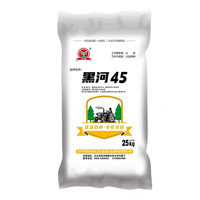 特征特性: 黑河45號(hào)在適應(yīng)區(qū)于6月底至7月初播種,出苗至成熟生育日數(shù)84天左右。亞有限結(jié)莢習(xí)性,株高60.48cm,底莢高12.03cm,分枝數(shù)0.52,單株莢數(shù)19.29,莢直形,單株粒數(shù)40.55,秕莢率3.33%,少分枝,白花,尖葉,灰色茸毛,莢直形,成熟時(shí)呈褐色。籽粒橢圓形,屬大粒種,種皮黃色,種臍淡黃色,有光澤,百粒重18.14g。